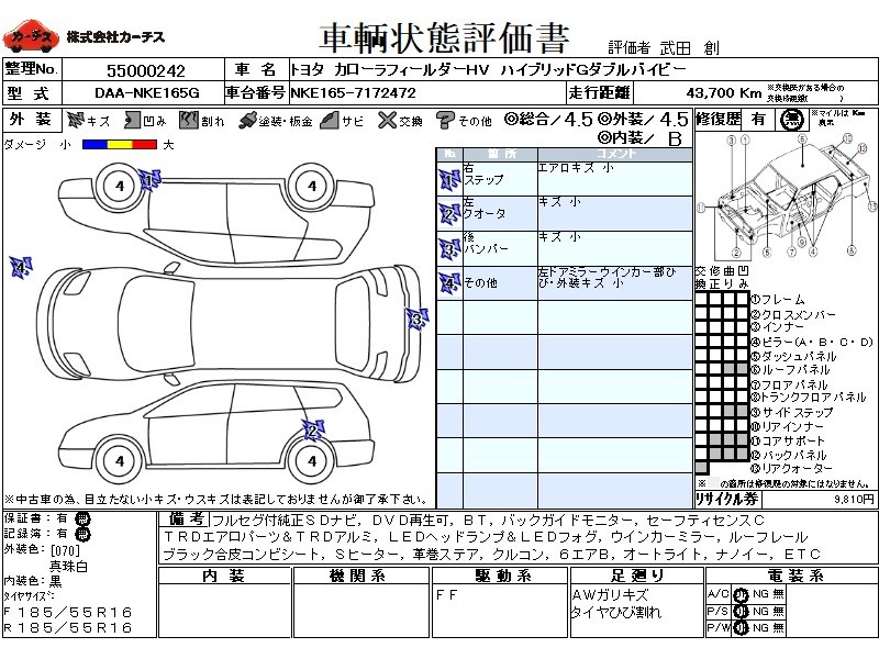 フル装備 / CD / 乗車定員(5人) / エアバッグ / 助手席エアバッグ / サイドエアバッグ / ABS / クルーズコントロール / カーナビゲーション(SSD) / テレビ(アナログ) / 地デジTV / バックカメラ / ETC / アルミホイール(16インチ) / スマートキー / ウインカーミラー / ハイマウントストップランプ / フォグランプ / サイドスポイラー / リアスポイラー / リアアンダースポイラー /