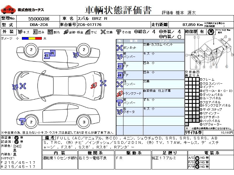 スバルのスポーティクーペ、BRZです。こちらはワンオーナー車で6速マニュアルシフト、STIスタイルパッケージも付いています。