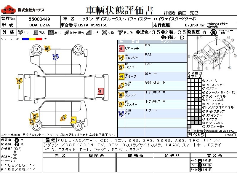 フル装備 / CD / 乗車定員(4人) / エアバッグ / 助手席エアバッグ / サイドエアバッグ / ABS / トラクションコントロール / カーナビゲーション(インダッシュ,SSD,2DIN) / テレビ(アナログ) / 地デジTV / バックカメラ(サイドカメラ) / ETC(社外) / アルミホイール(14インチ) / スマートキー / パワースライドドア / フォグランプ / サイドスポイラー / リアスポイラー /