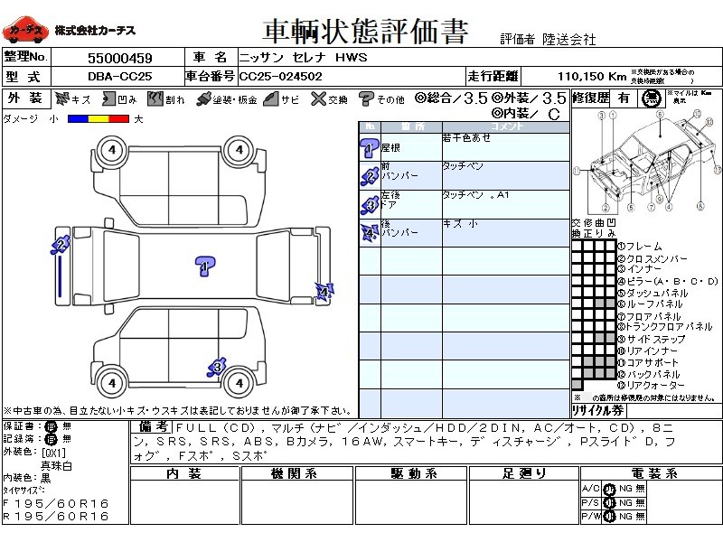 フル装備 / CD / マルチ(ナビ) / エアコン(オート) / 乗車定員(8人) / エアバッグ / 助手席エアバッグ / ABS / バックカメラ / ETC(社外) / アルミホイール(16インチ) / スマートキー / ディスチャージ / パワースライドドア / フォグランプ / フロントスポイラー / サイドスポイラー /