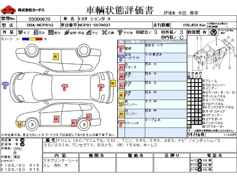 フル装備 / CD / 集中ドアロック / エアバッグ / 助手席エアバッグ / ABS / カーナビゲーション(インダッシュ,HDD,2DIN) / テレビ(アナログ) / バックカメラ / ETC(社外) / アルミホイール(社外)(15インチ) / キーレスエントリー / ハイマウントストップランプ /