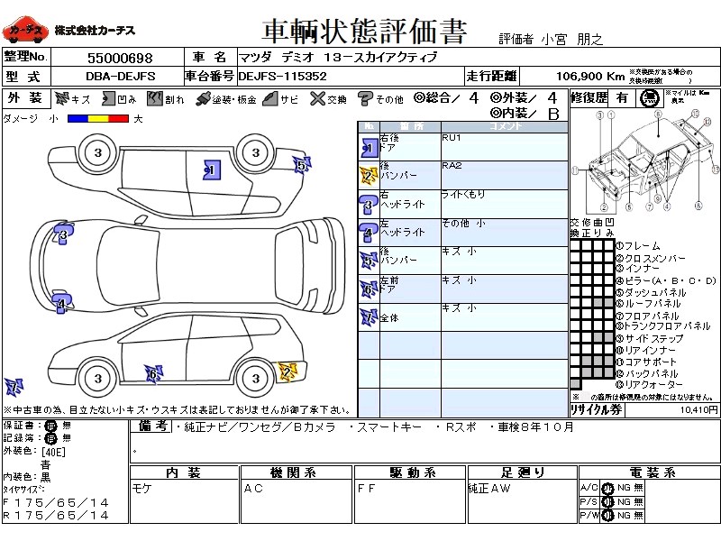 フル装備 / CD / 乗車定員(5人) / 集中ドアロック / エアバッグ / 助手席エアバッグ / ABS / カーナビゲーション(インダッシュ,SSD,2DIN) / テレビ(アナログ) / バックカメラ / アルミホイール(14インチ) / スマートキー / ハイマウントストップランプ / リアスポイラー /