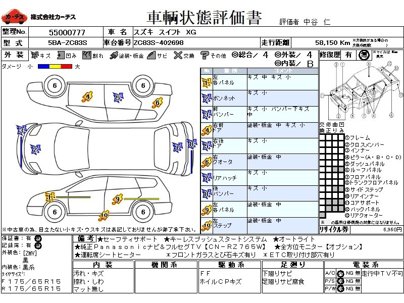 フル装備 / CD / 乗車定員(5人) / 集中ドアロック / エアバッグ / 助手席エアバッグ / サイドエアバッグ / ABS / トラクションコントロール / クルーズコントロール / カーナビゲーション(インダッシュ,SSD,2DIN) / 地デジTV / バックカメラ(フロント) / スマートキー / ハイマウントストップランプ /