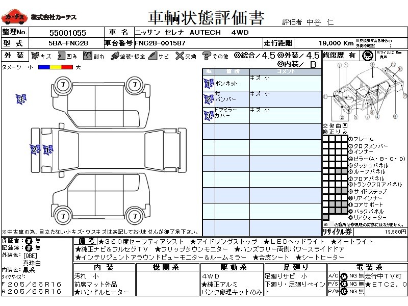 エアコン(オート) / パワーステアリング / パワーウィンドウ / 集中ドアロック / エアバッグ / 助手席エアバッグ / サイドエアバッグ / ABS / トラクションコントロール / クルーズコントロール / カーナビゲーション(オンダッシュ,SSD,2DIN) / 地デジTV / フリップダウンモニタ / バックカメラ(フロント) / ETC / アルミホイール(16インチ) / スマートキー / ウインカーミラー / ハイマウントストップランプ / パワースライドドア / フォグランプ / フロントスポイラー / サイドスポイラー / リアスポイラー / リアアンダースポイラー /