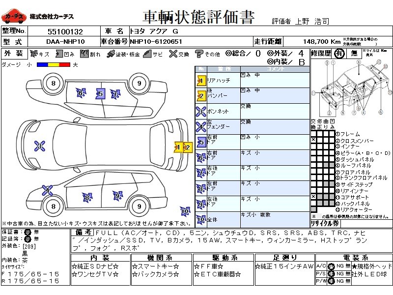 フル装備 / CD / 乗車定員(5人) / 集中ドアロック / エアバッグ / 助手席エアバッグ / ABS / トラクションコントロール / カーナビゲーション(インダッシュ,SSD) / テレビ(アナログ) / バックカメラ / ETC(社外) / アルミホイール(15インチ) / スマートキー / ウインカーミラー / ハイマウントストップランプ / フォグランプ / リアスポイラー /
