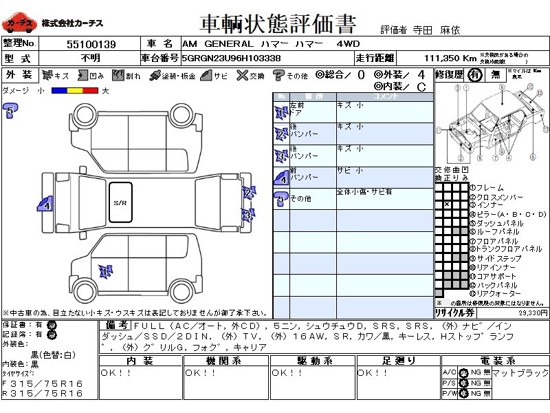 フル装備 / CD(社外) / 乗車定員(5人) / 集中ドアロック / エアバッグ / 助手席エアバッグ / カーナビゲーション(社外)(インダッシュ,SSD,2DIN) / テレビ(社外) / 地デジTV(社外) / ETC(社外) / アルミホイール(社外)(16インチ) / サンルーフ / 革シート(黒) / キーレスエントリー / ハイマウントストップランプ / フォグランプ / キャリア / マフラー(社外) /