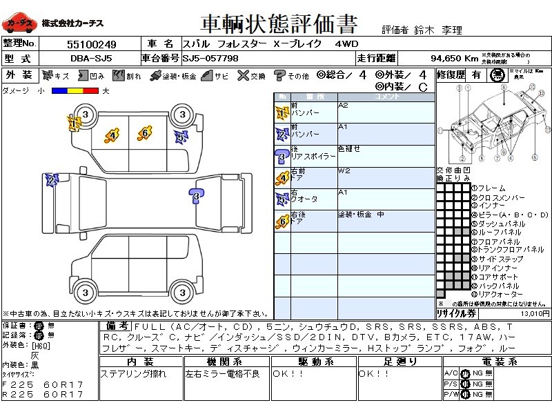 フル装備 / CD / 乗車定員(5人) / 集中ドアロック / エアバッグ / 助手席エアバッグ / サイドエアバッグ / ABS / トラクションコントロール / クルーズコントロール / カーナビゲーション(インダッシュ,SSD,2DIN) / 地デジTV / バックカメラ / ETC / アルミホイール(17インチ) / ハーフレザーシート / スマートキー / ディスチャージ / ウインカーミラー / ハイマウントストップランプ / パワーバックドア / フォグランプ / ルーフレール / リアスポイラー /