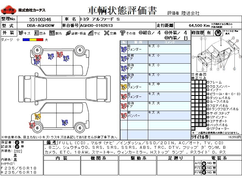 フル装備 / CD / マルチ(ナビ) / エアコン(オート) / テレビ(アナログ) / 乗車定員(8人) / 集中ドアロック / エアバッグ / 助手席エアバッグ / サイドエアバッグ / ABS / トラクションコントロール / 地デジTV / フリップダウンモニタ / バックカメラ / ETC / アルミホイール(18インチ) / スマートキー / ウインカーミラー / ハイマウントストップランプ / パワースライドドア / フォグランプ / リアスポイラー /
