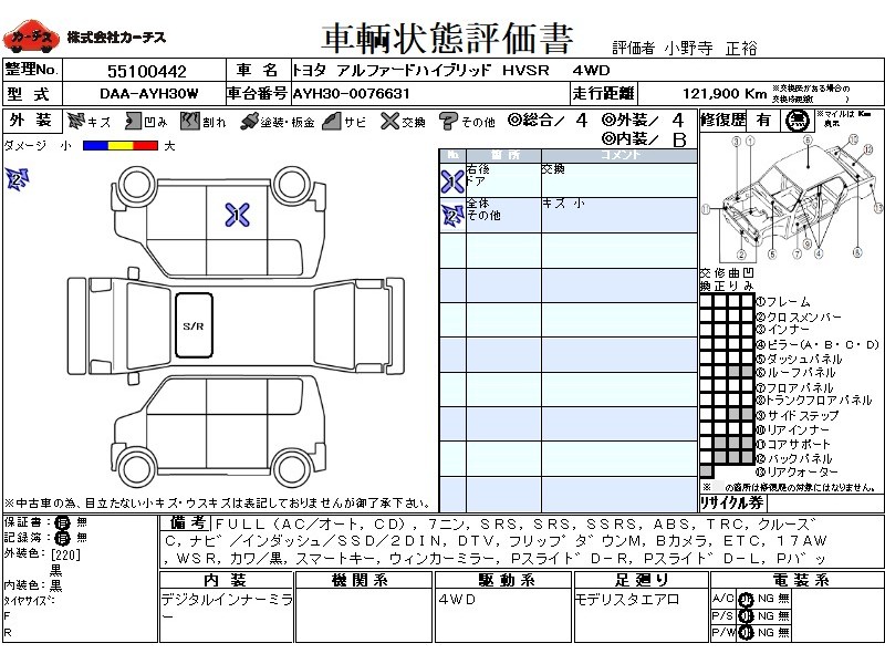 フル装備 / CD / 乗車定員(7人) / エアバッグ / 助手席エアバッグ / サイドエアバッグ / ABS / トラクションコントロール / クルーズコントロール / カーナビゲーション(インダッシュ,SSD,2DIN) / 地デジTV / フリップダウンモニタ / バックカメラ / ETC / アルミホイール(17インチ) / ダブルサンルーフ / 革シート(黒) / スマートキー / ウインカーミラー / パワースライドドア / パワーバックドア / フォグランプ / フロントスポイラー / サイドスポイラー / リアアンダースポイラー /