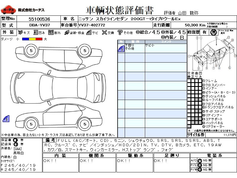 フル装備 / CD / 乗車定員(5人) / 集中ドアロック / エアバッグ / 助手席エアバッグ / サイドエアバッグ / ABS / トラクションコントロール / クルーズコントロール / カーナビゲーション(インダッシュ,HDD,2DIN) / テレビ(アナログ) / 地デジTV / バックカメラ / ETC / アルミホイール(19インチ) / 革シート(白) / スマートキー / ウインカーミラー / ハイマウントストップランプ / フォグランプ /