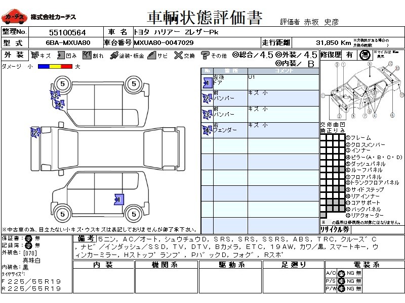 乗車定員(5人) / エアコン(オート) / パワーステアリング / パワーウィンドウ / 集中ドアロック / エアバッグ / 助手席エアバッグ / サイドエアバッグ / ABS / トラクションコントロール / クルーズコントロール / カーナビゲーション(インダッシュ,SSD) / テレビ(アナログ) / 地デジTV / バックカメラ / ETC / アルミホイール(19インチ) / 革シート(黒) / スマートキー / ウインカーミラー / ハイマウントストップランプ / パワーバックドア / フォグランプ / リアスポイラー /
