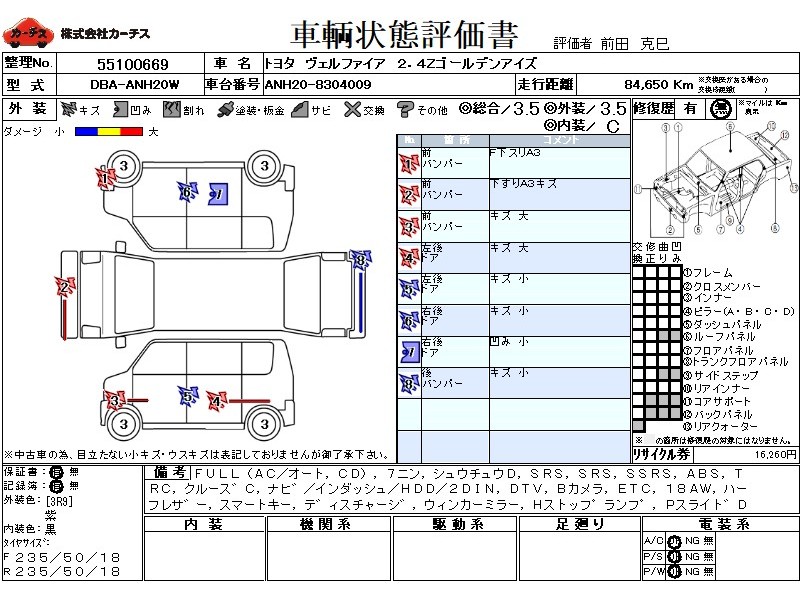 フル装備 / CD / 乗車定員(7人) / 集中ドアロック / エアバッグ / 助手席エアバッグ / サイドエアバッグ / ABS / トラクションコントロール / クルーズコントロール / カーナビゲーション(インダッシュ,HDD,2DIN) / 地デジTV / バックカメラ / ETC / アルミホイール(18インチ) / ハーフレザーシート / スマートキー / ディスチャージ / ウインカーミラー / ハイマウントストップランプ / パワースライドドア / パワーバックドア / フォグランプ / フロントスポイラー / サイドスポイラー / リアスポイラー / リアアンダースポイラー /