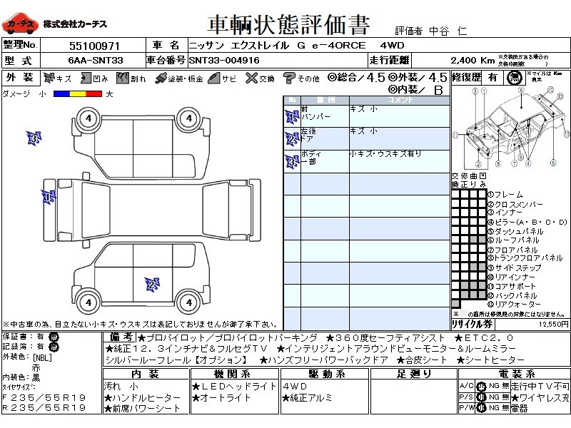 乗車定員(5人) / エアコン(オート) / パワーステアリング / パワーウィンドウ / 集中ドアロック / エアバッグ / 助手席エアバッグ / サイドエアバッグ / ABS / トラクションコントロール / クルーズコントロール / カーナビゲーション(オンダッシュ,SSD,2DIN) / 地デジTV / バックカメラ(フロント) / ETC / アルミホイール(19インチ) / スマートキー / ウインカーミラー / ハイマウントストップランプ / パワーバックドア / フォグランプ / ルーフレール /