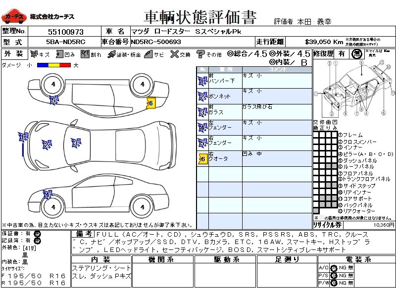 フル装備 / CD / 集中ドアロック / エアバッグ / 助手席エアバッグ / ABS / トラクションコントロール / クルーズコントロール / カーナビゲーション(ポップアップ,SSD) / 地デジTV / バックカメラ / ETC / アルミホイール(16インチ) / スマートキー / ハイマウントストップランプ / リアスポイラー(社外) / マフラー(社外) / 足回り /