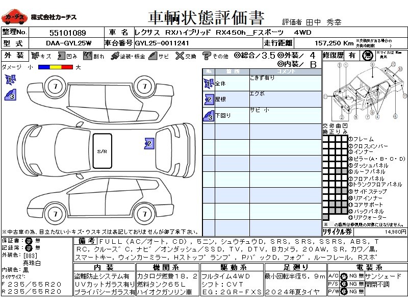 フル装備 / CD / 乗車定員(5人) / 集中ドアロック / エアバッグ / 助手席エアバッグ / サイドエアバッグ / ABS / トラクションコントロール / クルーズコントロール / カーナビゲーション(オンダッシュ,SSD) / テレビ(アナログ) / 地デジTV / バックカメラ / アルミホイール(20インチ) / サンルーフ / 革シート(黒) / スマートキー / ウインカーミラー / ハイマウントストップランプ / パワーバックドア / フォグランプ / ルーフレール / リアスポイラー /