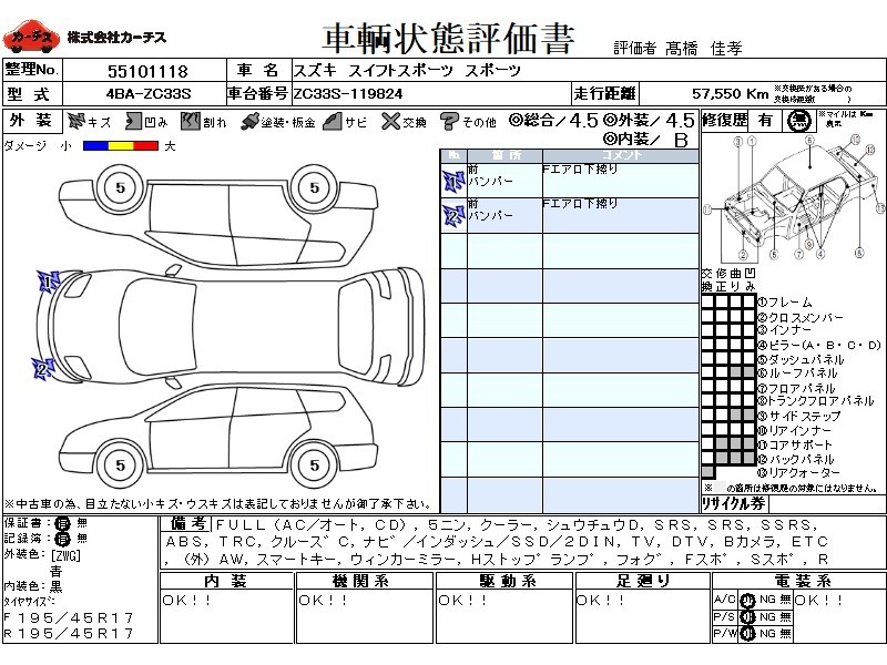 フル装備 / CD / 乗車定員(5人) / クーラー / 集中ドアロック / エアバッグ / 助手席エアバッグ / サイドエアバッグ / ABS / トラクションコントロール / クルーズコントロール / カーナビゲーション(インダッシュ,SSD,2DIN) / テレビ(アナログ) / 地デジTV / バックカメラ / ETC / アルミホイール(社外) / スマートキー / ウインカーミラー / ハイマウントストップランプ / フォグランプ / フロントスポイラー / サイドスポイラー / リアスポイラー / リアアンダースポイラー / マフラー(社外) / 足回り /