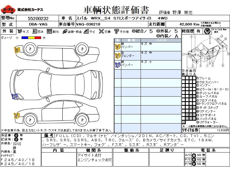 フル装備 / CD / マルチ(ナビ) / エアコン(オート) / テレビ(アナログ) / 乗車定員(5人) / エアバッグ / 助手席エアバッグ / サイドエアバッグ / ABS / トラクションコントロール / クルーズコントロール / バックカメラ(サイドカメラ) / ETC / アルミホイール(18インチ) / ハーフレザーシート / スマートキー / フォグランプ / フロントスポイラー / サイドスポイラー / リアスポイラー / リアアンダースポイラー /