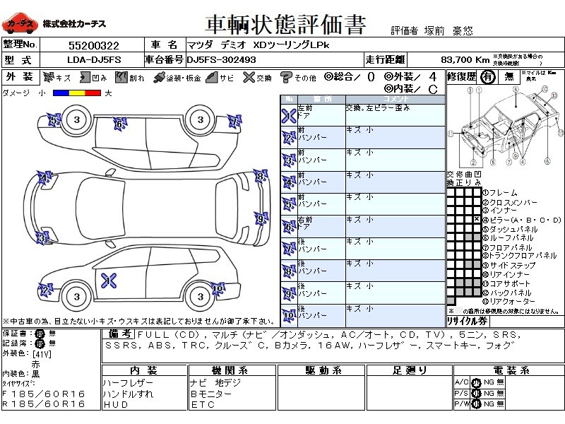 フル装備 / CD / マルチ(ナビ) / エアコン(オート) / テレビ(アナログ) / 乗車定員(5人) / 助手席エアバッグ / サイドエアバッグ / ABS / トラクションコントロール / クルーズコントロール / バックカメラ / ETC(社外) / アルミホイール(16インチ) / ハーフレザーシート / スマートキー / フォグランプ /