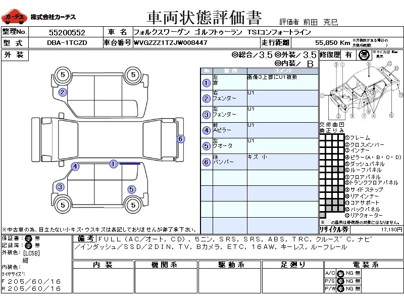フル装備 / CD / 乗車定員(5人) / エアバッグ / 助手席エアバッグ / ABS / トラクションコントロール / クルーズコントロール / カーナビゲーション(インダッシュ,SSD,2DIN) / テレビ(アナログ) / バックカメラ / ETC / アルミホイール(16インチ) / キーレスエントリー / ルーフレール /
