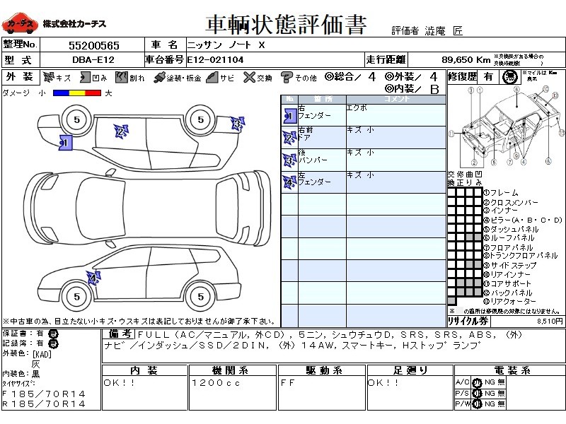フル装備 / CD(社外) / 乗車定員(5人) / 集中ドアロック / エアバッグ / 助手席エアバッグ / ABS / カーナビゲーション(社外)(インダッシュ,SSD,2DIN) / 地デジTV(社外) / ETC(社外) / アルミホイール(社外)(14インチ) / スマートキー / ハイマウントストップランプ /