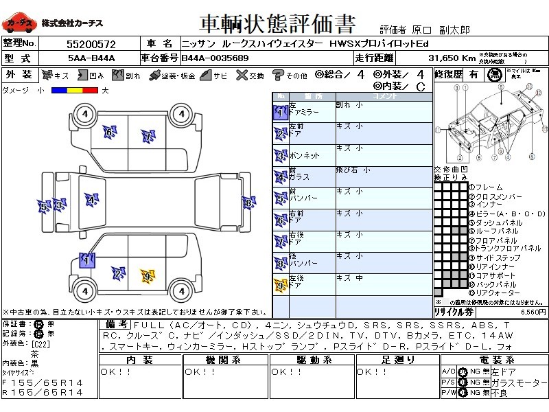 フル装備 / CD / 乗車定員(4人) / 集中ドアロック / エアバッグ / 助手席エアバッグ / サイドエアバッグ / ABS / トラクションコントロール / クルーズコントロール / カーナビゲーション(インダッシュ,SSD,2DIN) / テレビ(アナログ) / 地デジTV / バックカメラ / ETC / アルミホイール(14インチ) / スマートキー / ウインカーミラー / ハイマウントストップランプ / パワースライドドア / フォグランプ / リアスポイラー /