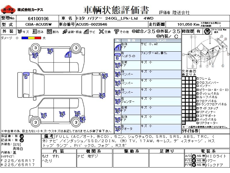 フル装備 / CD(社外) / 乗車定員(5人) / 集中ドアロック / エアバッグ / 助手席エアバッグ / ABS / トラクションコントロール / カーナビゲーション(社外)(インダッシュ,SSD,2DIN) / テレビ(社外) / 地デジTV(社外) / アルミホイール(17インチ) / キーレスエントリー / ディスチャージ / ハイマウントストップランプ / パワーバックドア / フォグランプ / リアスポイラー /