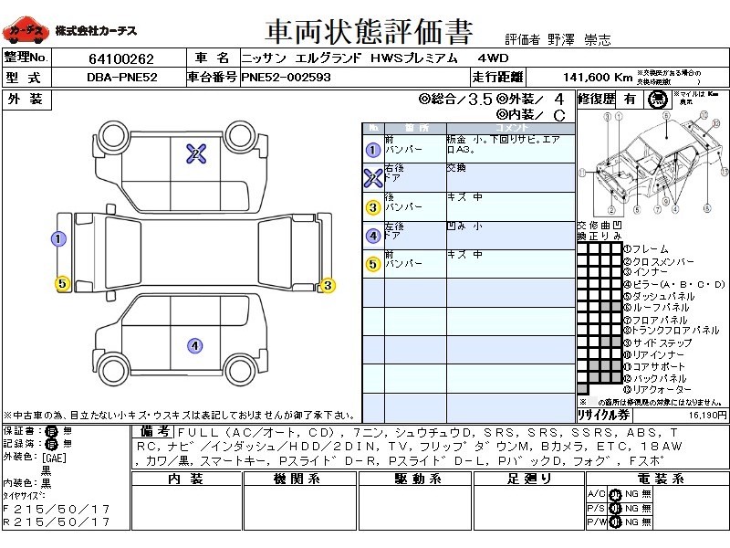 フル装備 / CD / 乗車定員(7人) / 集中ドアロック / エアバッグ / 助手席エアバッグ / サイドエアバッグ / ABS / トラクションコントロール / カーナビゲーション(インダッシュ,HDD,2DIN) / テレビ(アナログ) / フリップダウンモニタ / バックカメラ / ETC / アルミホイール(18インチ) / 革シート(黒) / スマートキー / パワースライドドア / パワーバックドア / フォグランプ / フロントスポイラー /