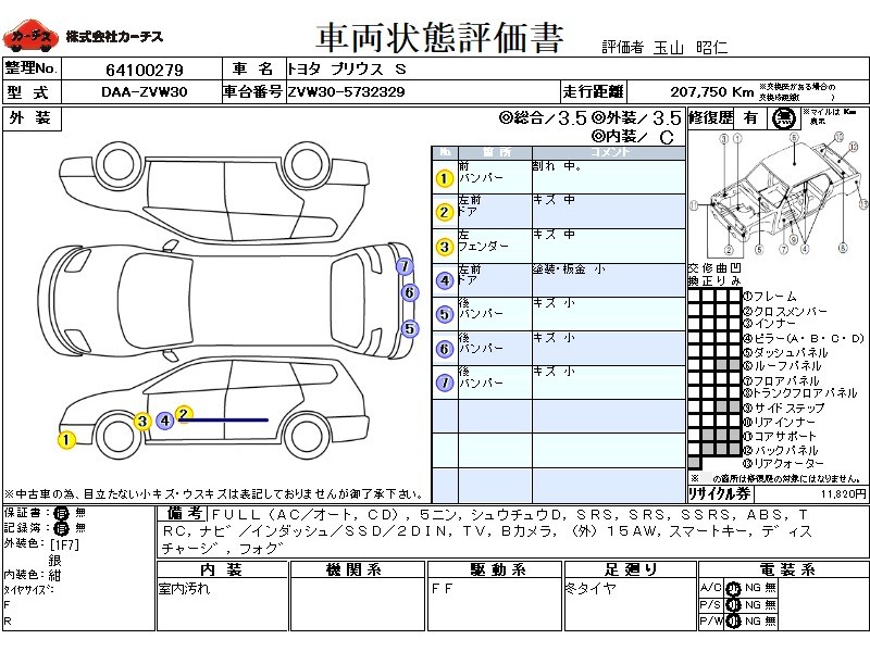 フル装備 / CD / 乗車定員(5人) / 集中ドアロック / エアバッグ / 助手席エアバッグ / サイドエアバッグ / ABS / トラクションコントロール / カーナビゲーション(インダッシュ,SSD,2DIN) / テレビ(アナログ) / バックカメラ / アルミホイール(社外)(15インチ) / スマートキー / ディスチャージ / フォグランプ /