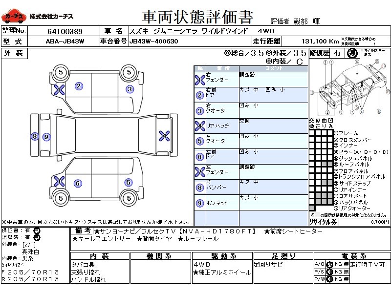 フル装備 / CD(社外) / 乗車定員(4人) / 集中ドアロック / エアバッグ / 助手席エアバッグ / ABS / カーナビゲーション(社外)(インダッシュ,HDD,2DIN) / 地デジTV(社外) / ETC(社外) / アルミホイール(15インチ) / キーレスエントリー / ウインカーミラー / ハイマウントストップランプ / 背面タイヤ / フォグランプ / ルーフレール /