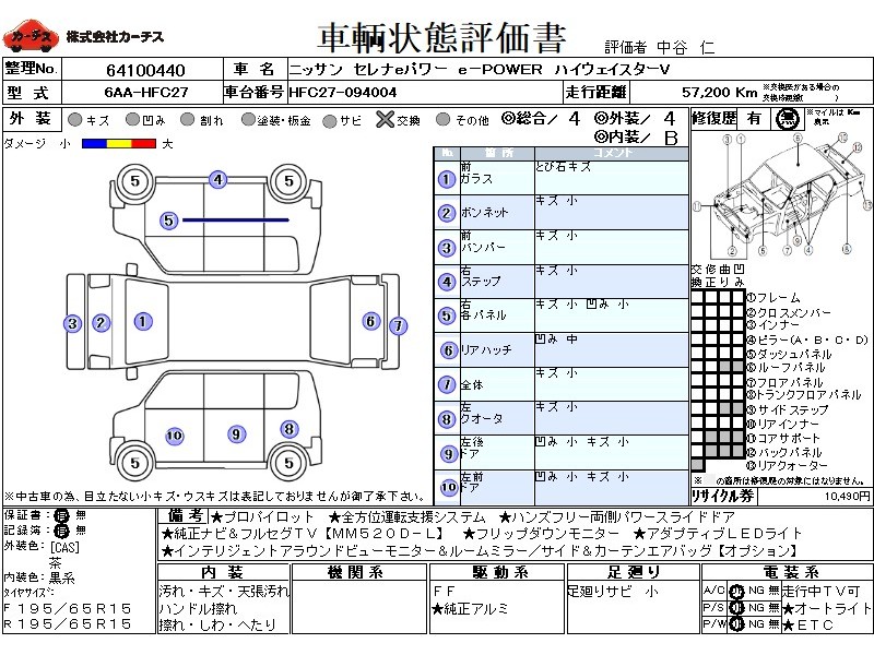 フル装備 / CD / 乗車定員(7人) / 集中ドアロック / エアバッグ / 助手席エアバッグ / サイドエアバッグ / ABS / トラクションコントロール / クルーズコントロール / カーナビゲーション(インダッシュ,SSD,2DIN) / 地デジTV / フリップダウンモニタ / バックカメラ(フロント) / ETC / アルミホイール(15インチ) / スマートキー / ウインカーミラー / ハイマウントストップランプ / パワースライドドア / フォグランプ /