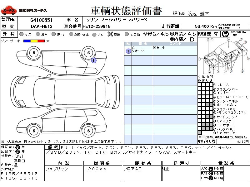 フル装備 / CD / 乗車定員(5人) / エアバッグ / 助手席エアバッグ / ABS / トラクションコントロール / カーナビゲーション(インダッシュ,SSD,2DIN) / テレビ(アナログ) / 地デジTV / バックカメラ(サイドカメラ) / アルミホイール(15インチ) / スマートキー /