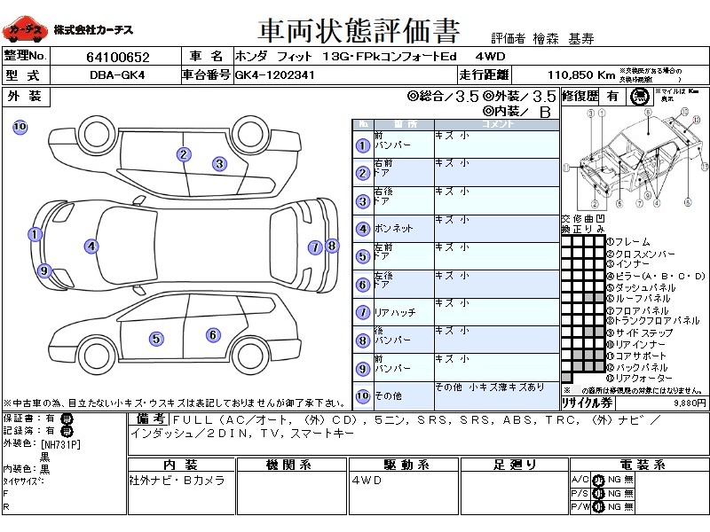 フル装備 / CD(社外) / 乗車定員(5人) / エアバッグ / 助手席エアバッグ / ABS / トラクションコントロール / カーナビゲーション(社外)(インダッシュ,SSD,2DIN) / テレビ(社外) / 地デジTV(社外) / スマートキー /