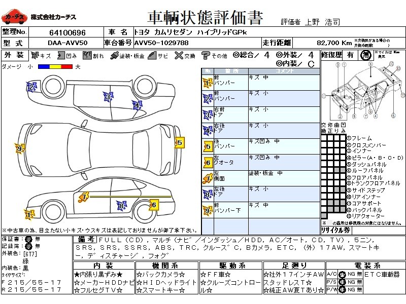 フル装備 / CD / マルチ(ナビ) / エアコン(オート) / テレビ(アナログ) / 乗車定員(5人) / エアバッグ / 助手席エアバッグ / サイドエアバッグ / ABS / トラクションコントロール / クルーズコントロール / バックカメラ / ETC / アルミホイール(社外)(17インチ) / スマートキー / ディスチャージ / フォグランプ /