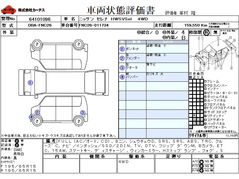 フル装備 / CD / 乗車定員(8人) / 集中ドアロック / エアバッグ / 助手席エアバッグ / ABS / トラクションコントロール / クルーズコントロール / カーナビゲーション(インダッシュ,SSD,2DIN) / テレビ(アナログ) / 地デジTV / フリップダウンモニタ / バックカメラ / ETC / アルミホイール(15インチ) / スマートキー / ディスチャージ / ウインカーミラー / ハイマウントストップランプ / フォグランプ / サイドスポイラー /
