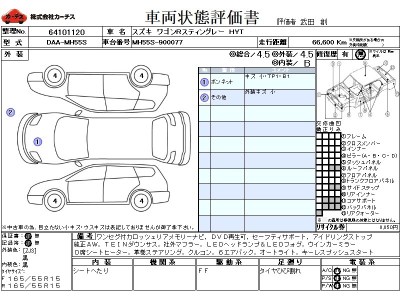 フル装備 / CD(社外) / 乗車定員(4人) / エアバッグ / 助手席エアバッグ / サイドエアバッグ / ABS / トラクションコントロール / クルーズコントロール / カーナビゲーション(社外)(SSD) / テレビ(社外) / 地デジTV(社外) / アルミホイール(15インチ) / スマートキー / ウインカーミラー / ハイマウントストップランプ / フォグランプ / サイドスポイラー / リアスポイラー / マフラー(社外) / 足回り /