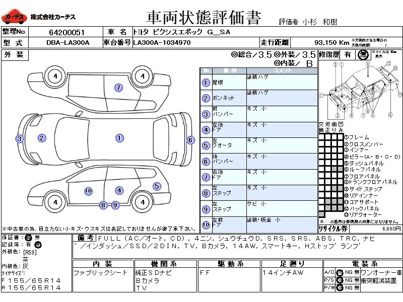 フル装備 / CD / 乗車定員(4人) / 集中ドアロック / エアバッグ / 助手席エアバッグ / ABS / トラクションコントロール / カーナビゲーション(インダッシュ,SSD,2DIN) / テレビ(アナログ) / バックカメラ / ETC(社外) / アルミホイール(14インチ) / スマートキー / ハイマウントストップランプ /