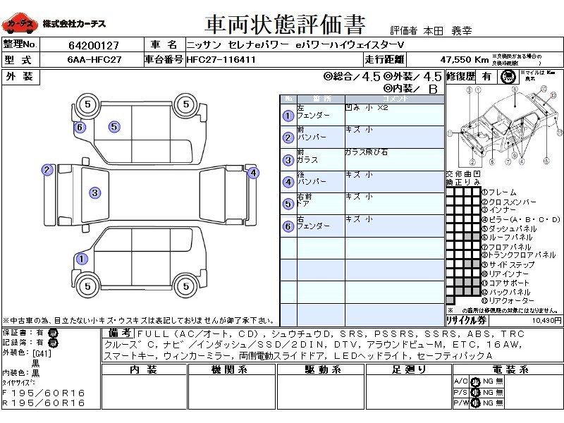 フル装備 / CD / 集中ドアロック / エアバッグ / 助手席エアバッグ / サイドエアバッグ / ABS / トラクションコントロール / クルーズコントロール / カーナビゲーション(インダッシュ,SSD,2DIN) / 地デジTV / バックカメラ(フロント) / ETC / アルミホイール(16インチ) / スマートキー / ウインカーミラー / ハイマウントストップランプ / パワースライドドア / フォグランプ / サイドスポイラー / リアスポイラー /