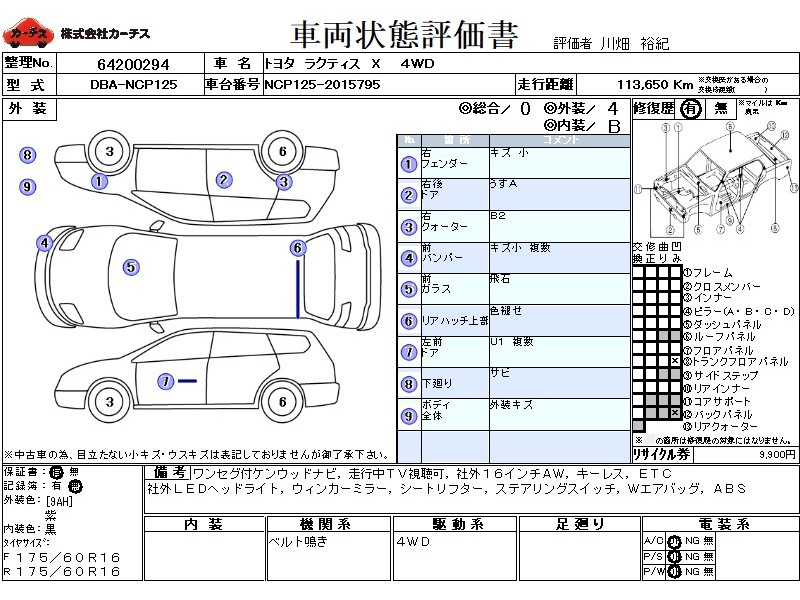 フル装備 / CD(社外) / 乗車定員(5人) / エアバッグ / 助手席エアバッグ / ABS / カーナビゲーション(社外)(SSD) / テレビ(社外) / 地デジTV(社外) / ETC(社外) / アルミホイール(社外)(16インチ) / キーレスエントリー / ウインカーミラー / ハイマウントストップランプ / リアスポイラー /