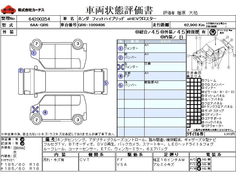 フル装備 / CD / エアバッグ / 助手席エアバッグ / サイドエアバッグ / ABS / トラクションコントロール / クルーズコントロール / カーナビゲーション(インダッシュ,2DIN) / 地デジTV / バックカメラ / ETC / アルミホイール(16インチ) / スマートキー / ウインカーミラー / フォグランプ / ルーフレール /