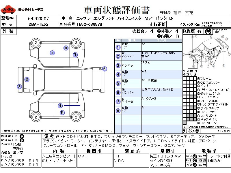 フル装備 / CD / 乗車定員(7人) / エアバッグ / 助手席エアバッグ / サイドエアバッグ / ABS / トラクションコントロール / クルーズコントロール / カーナビゲーション(インダッシュ,HDD) / 地デジTV / フリップダウンモニタ / バックカメラ(フロント) / ETC / アルミホイール(18インチ) / スマートキー / ウインカーミラー / パワースライドドア / フォグランプ / フロントスポイラー / サイドスポイラー / リアスポイラー /