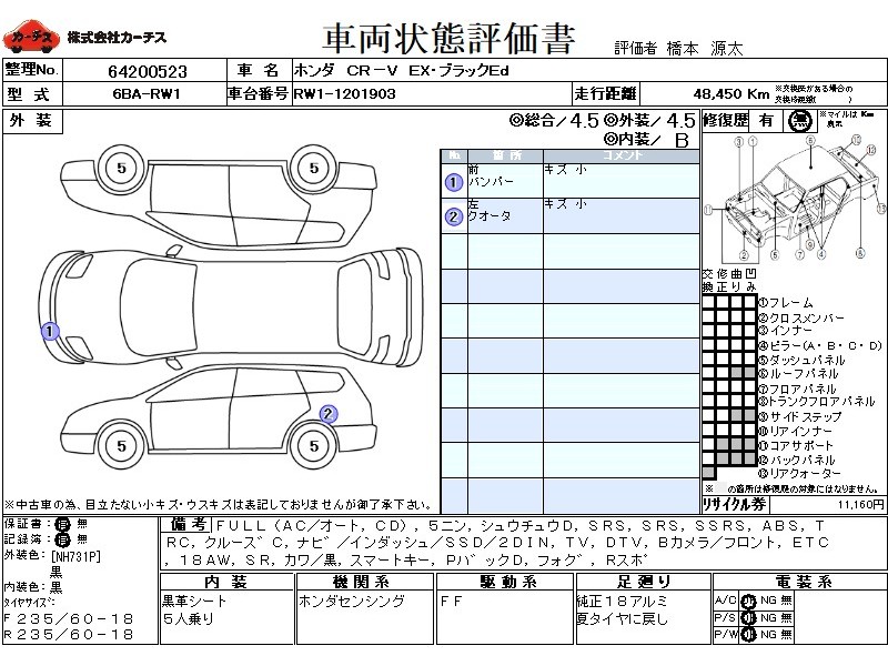 ワンオーナー車。ホンダセンシング、ガラスサンルーフ、純正ナビTV&前後カメラ&ETC2.0、黒革シート、前席&ステアリングヒーター、純正前後ドラレコ、パワーバックドア、LEDヘッドライト、純正18アルミ、スマートキー2個