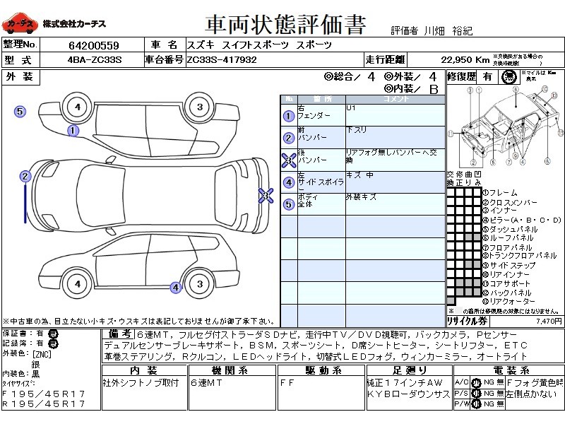 フル装備 / CD(社外) / 乗車定員(5人) / エアバッグ / 助手席エアバッグ / サイドエアバッグ / ABS / クルーズコントロール / カーナビゲーション(社外)(SSD) / テレビ(社外) / 地デジTV(社外) / ETC(社外) / アルミホイール(17インチ) / スマートキー / ウインカーミラー / ハイマウントストップランプ / フォグランプ / サイドスポイラー / リアスポイラー / 足回り /