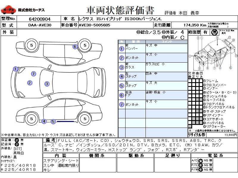 フル装備 / CD / 集中ドアロック / エアバッグ / 助手席エアバッグ / サイドエアバッグ / ABS / トラクションコントロール / クルーズコントロール / カーナビゲーション(インダッシュ,SSD,2DIN) / 地デジTV / バックカメラ / ETC / アルミホイール(社外)(18インチ) / 革シート(黒) / スマートキー / ウインカーミラー / ハイマウントストップランプ / フォグランプ / リアスポイラー / リアアンダースポイラー /