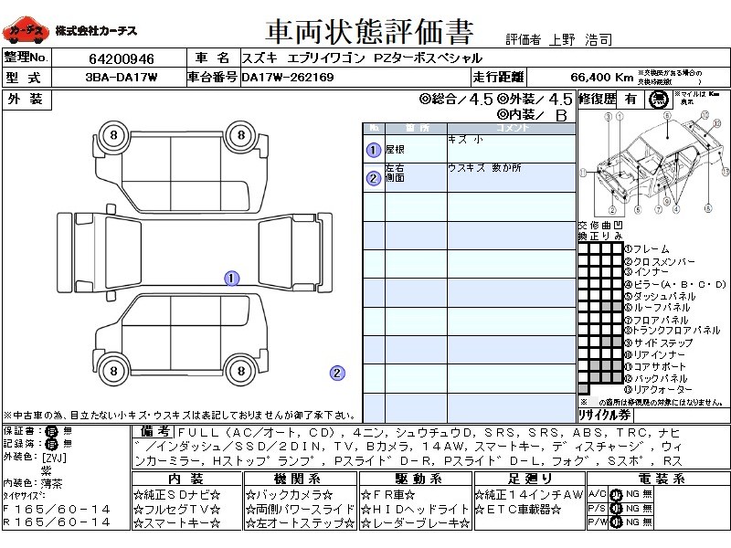 フル装備 / CD / 乗車定員(4人) / 集中ドアロック / エアバッグ / 助手席エアバッグ / ABS / トラクションコントロール / カーナビゲーション(インダッシュ,SSD,2DIN) / テレビ(アナログ) / バックカメラ / ETC(社外) / アルミホイール(14インチ) / スマートキー / ディスチャージ / ウインカーミラー / ハイマウントストップランプ / パワースライドドア / フォグランプ / サイドスポイラー / リアスポイラー /