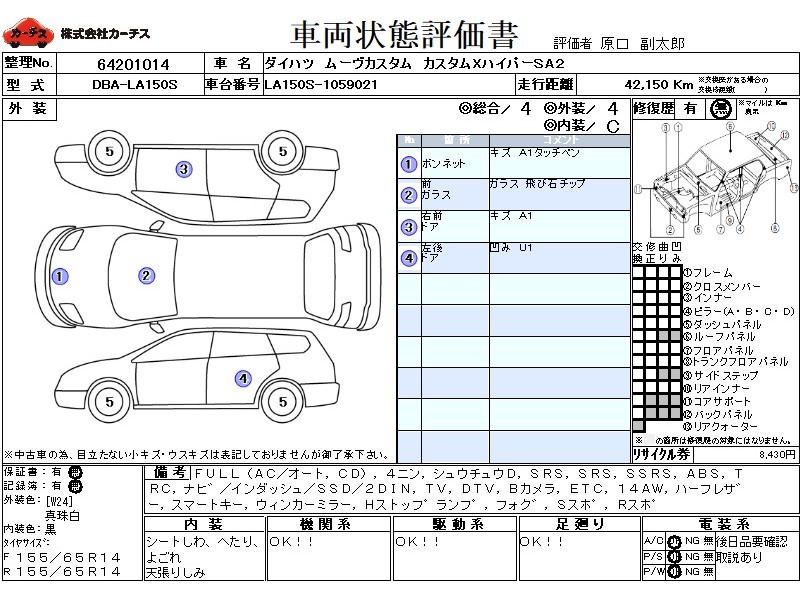 フル装備 / CD / 乗車定員(4人) / 集中ドアロック / エアバッグ / 助手席エアバッグ / サイドエアバッグ / ABS / トラクションコントロール / カーナビゲーション(インダッシュ,SSD,2DIN) / テレビ(アナログ) / 地デジTV / バックカメラ / ETC / アルミホイール(14インチ) / ハーフレザーシート / スマートキー / ウインカーミラー / ハイマウントストップランプ / フォグランプ / サイドスポイラー / リアスポイラー /