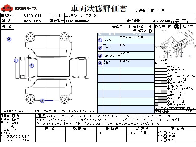 乗車定員(4人) / エアコン(オート) / パワーステアリング / パワーウィンドウ / エアバッグ / 助手席エアバッグ / サイドエアバッグ / ABS / バックカメラ(フロント) / ETC / スマートキー / ウインカーミラー / ハイマウントストップランプ / パワースライドドア /