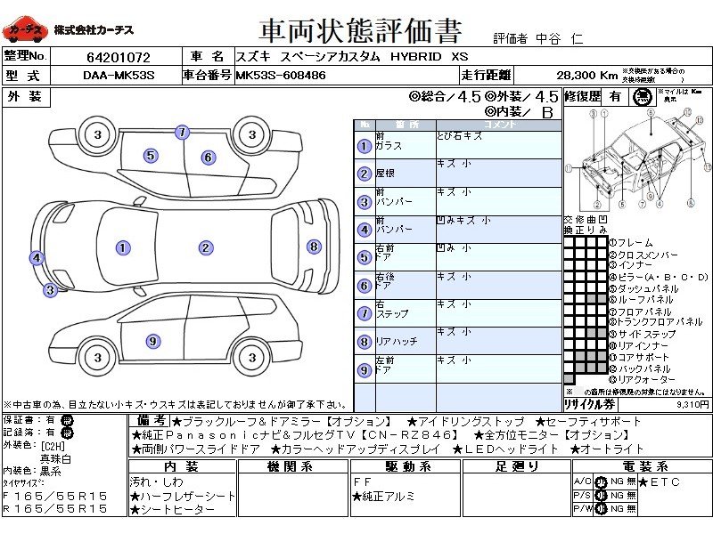 フル装備 / CD / 乗車定員(4人) / 集中ドアロック / エアバッグ / 助手席エアバッグ / サイドエアバッグ / ABS / トラクションコントロール / カーナビゲーション(インダッシュ,SSD,2DIN) / 地デジTV / バックカメラ(フロント) / ETC(社外) / アルミホイール(15インチ) / ハーフレザーシート / スマートキー / ウインカーミラー / ハイマウントストップランプ / パワースライドドア / フォグランプ / サイドスポイラー / リアスポイラー /