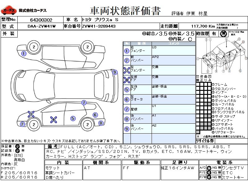 フル装備 / CD / 乗車定員(5人) / 集中ドアロック / エアバッグ / 助手席エアバッグ / サイドエアバッグ / ABS / トラクションコントロール / カーナビゲーション(インダッシュ,SSD,2DIN) / テレビ(アナログ) / バックカメラ / ETC / アルミホイール(16インチ) / スマートキー / ウインカーミラー / ハイマウントストップランプ / フォグランプ / リアスポイラー /