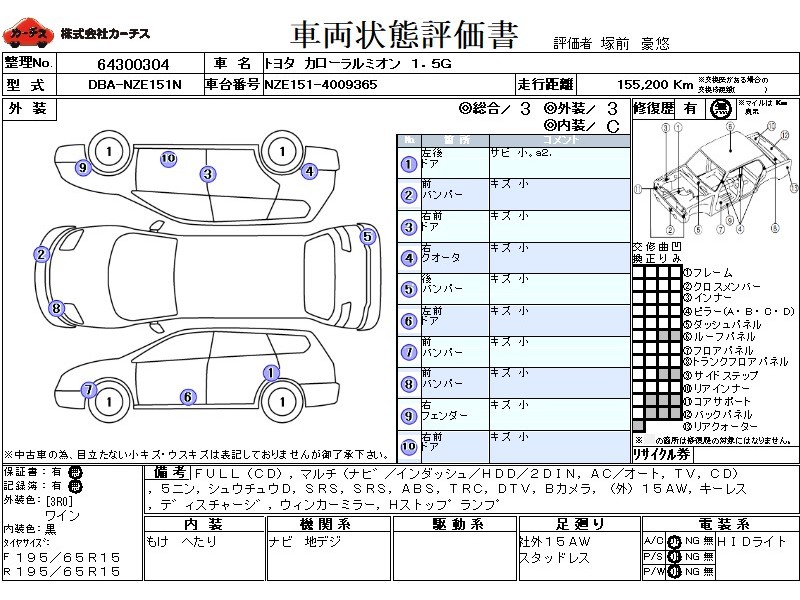 フル装備 / CD / マルチ(ナビ) / エアコン(オート) / テレビ(アナログ) / 乗車定員(5人) / 集中ドアロック / エアバッグ / 助手席エアバッグ / ABS / トラクションコントロール / 地デジTV / バックカメラ / ETC(社外) / アルミホイール(社外)(15インチ) / キーレスエントリー / ディスチャージ / ウインカーミラー / ハイマウントストップランプ /