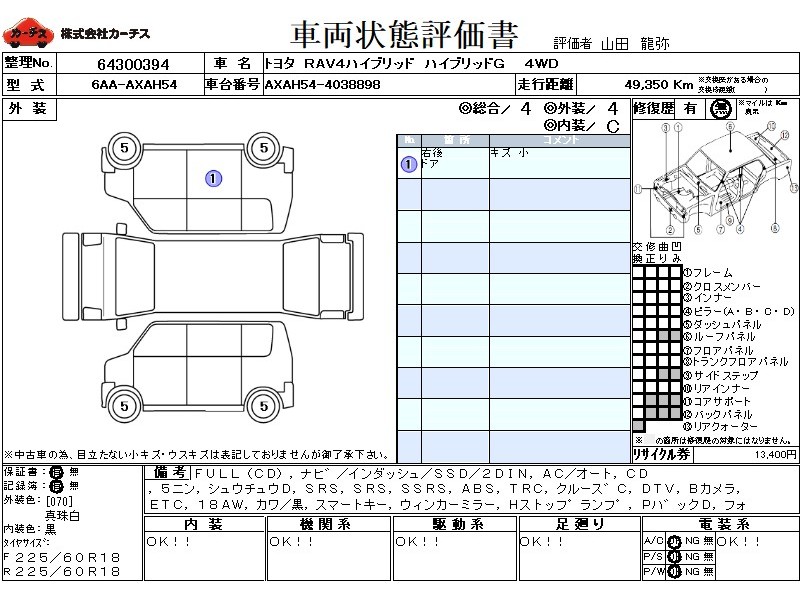 フル装備 / CD / 乗車定員(5人) / 集中ドアロック / エアバッグ / 助手席エアバッグ / サイドエアバッグ / ABS / トラクションコントロール / クルーズコントロール / カーナビゲーション(インダッシュ,SSD,2DIN) / テレビ(アナログ) / 地デジTV / バックカメラ / ETC / アルミホイール(18インチ) / 革シート(黒) / スマートキー / ウインカーミラー / ハイマウントストップランプ / パワーバックドア / フォグランプ / ルーフレール / リアスポイラー /